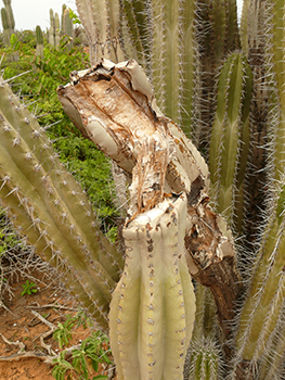 Soms is het nog helemaal niet duidelijk of een probleem met lokale planten en bomen te wijten is aan een invasieve soort. Wie de afgelopen jaren goed heeft gekeken naar de pittoreske zuilcactussen op het eiland heeft waarschijnlijk opgemerkt dat het niet zo goed gaat met de Kadushi’s (Cereus repandus). De cactuspopulatie heeft het zwaar te verduren en op verschillende plekken is de afsterving van grote, majestueuze cactussen te zien. Uit persoonlijke observaties is op te maken dat de cactussen een vast afstervingspatroon doormaken. Aan een tak waar een ‘wond’ is ontstaan begint het weefsel rond de ‘wond’ te rotten. Dit verspreidt zich langzaam tot de hele tak en van daaruit naar de rest van de cactus. De plant verrot in feite van binnen naar buiten en veranderd in een stinkende weke massa. Tot de cactus omvalt en uitdroogt. Vanuit de afgevallen takken groeien geen nieuwe takken, zoals normaal wel het geval is, en ook uit het wortelstelsel lijkt niets nieuws meer te groeien. Observaties wezen uit dat de ‘wonden’ vaak worden veroorzaakt door de lokale Maisparkiet, Prikichi (Eupsittula pertinax pertinax), maar dat het rottingsproces hoogstwaarschijnlijk door een schimmel of bacterie wordt veroorzaakt. Een organisme die vermoedelijk hier niet thuis hoort en dus waarschijnlijk is geïmporteerd, maar die een ware ravage aan het aanrichten is onder de cactussen, de hoekstenen van onze natuur. Onderzoek naar het ziektebeeld en de mogelijke veroorzakers ervan is dan ook noodzakelijk, zeker omdat Kadushi’s graag worden gegeten op het eiland, en de veroorzaker van de cactuskiller potentieel gevaarlijk is voor de volksgezondheid. Overigens is het bovenstaande slechts aangetroffen bij de Kadushi en niet bij de Datu (Stenocereus griseus) of de Kadushi di pushi (Pilosocereus lanuginosus). Ook de bladcactussen hebben er geen last van. Tot op heden is er echter geen onderzoek gedaan naar dit fenomeen, dat reeds in 2008 werd gemeldt.