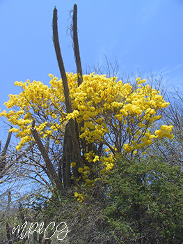 Ook het argument dat ze langzaam zouden groeien is onzin te noemen. Ze groeien langzaam in de natuur waar ze totaal afhankelijk zijn van elke druppel regen die er valt, maar in een tuin waar tenminste eenmaal per week de sproeier aangaat groeien ze een stuk harder. Een Wayaca (Guaiacum officinale )in een tuin op een kalk klip hebben we in 2,5 jaar tijd zien uitgroeien tot een boompje van 2 meter hoog, compleet met bloemen en zaden. Kaal worden is ook geen smoes. Elke boom verliest blaadjes. Dat is normaal. Een lokale boom wordt kaal als het droog wordt en er dus niet genoeg vocht is om kostbare nieuwe blaadjes te produceren. Geef de boom water en er zullen nieuwe blaadjes blijven komen. Er zijn genoeg lokale planten en bomen om voor te kiezen. De Kibrahacha (Handroanthus billbergii) met zijn prachtige gele bloemen in de regentijd is daar een van. Maar ook de Brasia (Haematoxylum brasiletto) die vaak verward wordt met de Kibrahacha is een dankbare boom, die met zijn grillige stam ook nog een een extra esthetische aspect aanbrengt in de tuin en veel vogels aantrekt wanneer die bloeit, waaronder kolibries. De al vaak genoemde Wayaca is helemaal de moeite waard. Chuchubi’s of Caribische spotlijsters zijn gek op de rode zaden van deze boom. In de maag van de vogel wordt het rode laagje eraf verteerd en het zwarte zaad wordt uitgepoept. Pas dan kan het ontkiemen. Heb je Chuchubi’s in de tuin dan is het bijna zeker dat je op gegeven moment een kleine Wayaca uit de grond ziet komen. Wil je het op een andere plek hebben dan moet je het plantje snel uitgraven en planten op de plek waar je het wil hebben. De plant investeert namelijk als eerste in een lange wortel die op zoek gaat naar water. Wanneer dit geconsolideerd is gaat het pas investeren in de rest van de plant. Met bewateren bespoedig je dit proces. Het mooie van de Wayaca is dat de plant het gehele jaar door groen blijft en daarbij ook zeer weinig water nodig heeft. En dat is nu precies het punt. Weinig kosten, veel plezier en ook nog een lokale plant in de tuin.