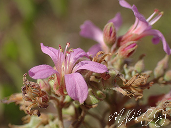 On Aruba, Bonaire, and Curaçao, several plants grow whose Papiamento or Papiamentu name includes the word Basora (broom), and the Basora kòrá (Bonaire and Curaçao) or Betonica (Aruba) is one of them. This very common shrub is often overlooked when it’s not blooming, and many people remove it from their gardens when it grows and flowers on its own, assuming it’s a weed. This is a shame. As an ornamental, it may not look particularly striking, but experience shows that with careful care and watering, this species grows into a lush, rounded shrub with beautiful gray-green leaves (covered with a fine down) and striking purplish-pink flowers. If the plant grows without pruning and occasional watering, it loses its shape, the leaves remain smaller, and the plant is really only identifiable by its flowers. During the dry season, the plant will wither away until only a few branches with scattered dry leaves remain, until the next rain shower stimulates growth again.