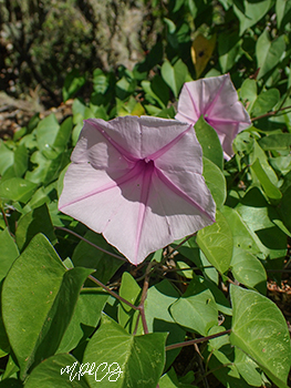 This plant belongs to the morning glory family, and its flowering behaviour, blooming in the cool morning hours, perfectly illustrates this. Like other members of the family, this plant is a climber and grows over other plants, forming long carpets of bright green foliage with heart-shaped leaves and characteristic large pink flowers, which are very delicate and glassy. Hence the name in Papiamento, Yerba di glas, which can be translated as “glass flower.” The flowers can grow to almost 7 centimeters long and, as mentioned, vary considerably in color, from lilac to lilac-pink and light pink. The flowers open only in the morning and close as soon as it gets warmer and the sun shines brighter. Sometimes you’ll even see a single flower blooming in the evening.
