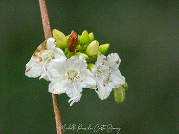 Our islands have multiple species of plants that belong to the Morning glory family in the wild. One of the most inconspicuous but also one of the most delicate of them is what we call the Yerba di sas (known as both Jacquemontia nodiflora and/or Convolvulus nodiflorus) in Papiamentu. This plant is especially visible in the rainy season when the plant can be found in more humid areas. On Curaçao Christoffelpark is one of the locations it is seen more abundantly than anywhere else on the island in the months of November and December, when rains turn the hills of the area lusciously green. This morning glory member will grow in and over other plants but never gets so spread out that it will cover other plants completely. It can be recognized first and foremost by the small 1,5 cm long, but delicately formed white flowers that grow in clusters and attract a massive number of insects. The vines of the plant are covered with hairs and the rounded small egg-shaped leaves are also covered in velvet-like hairs. Because of the hairs the leaves sometimes appear to be blue-green in their coloration.